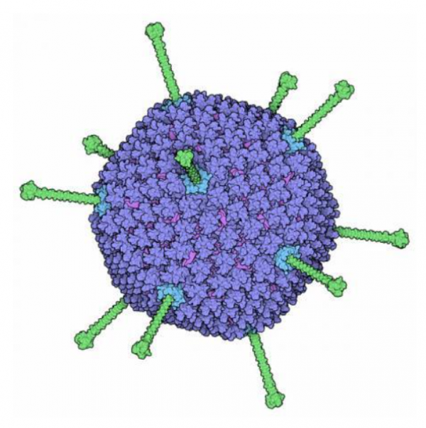 腺病毒是一個大家庭。腺病毒科含有多個屬,可以感染哺乳動物、禽類、魚、青蛙等多種生物。腺病毒為雙鏈DNA病毒,沒有囊膜,外層為由1600多個分子組成的衣殼,血清型眾多,耐酸、耐低溫、耐有機溶劑。六鄰體上面插著纖維尾絲(主要保護性抗原),讓病毒形似通訊衛星。