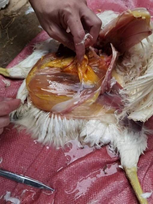 茂名某規模化蛋雞場飼養蛋雞3棟,單棟1.5萬只。A棟雞從開產到230日齡產蛋率一直上不去,維持在85%左右。大群采食量和飲水正常,平均每只雞采食量為105g,大群精神狀況良好,糞便正常。臨床觀察發現個別雞只(30只左右)腹部膨大下垂,觸之有波動感。頭頸高舉,行走時呈企鵝狀姿勢。B棟和C棟無此情況。